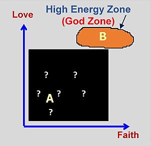 Isn't this the same "God State" described right in the beginning in Section 1.2, "Current Understanding of Spirituality"? We stated that a high spiritual state is characterised by three characteristics - Compassion, Power and Enlightenment. This definition aligns well with our "mathematical" representation in Fig. 7, as the God State is indeed characterised by high positive feelings (compassionate) and high mental energy (powerful). It is a highly spiritual and powerful state of mind. God Zones are areas where the measures of confidence, love, faith, hope, etc. are extremely high.